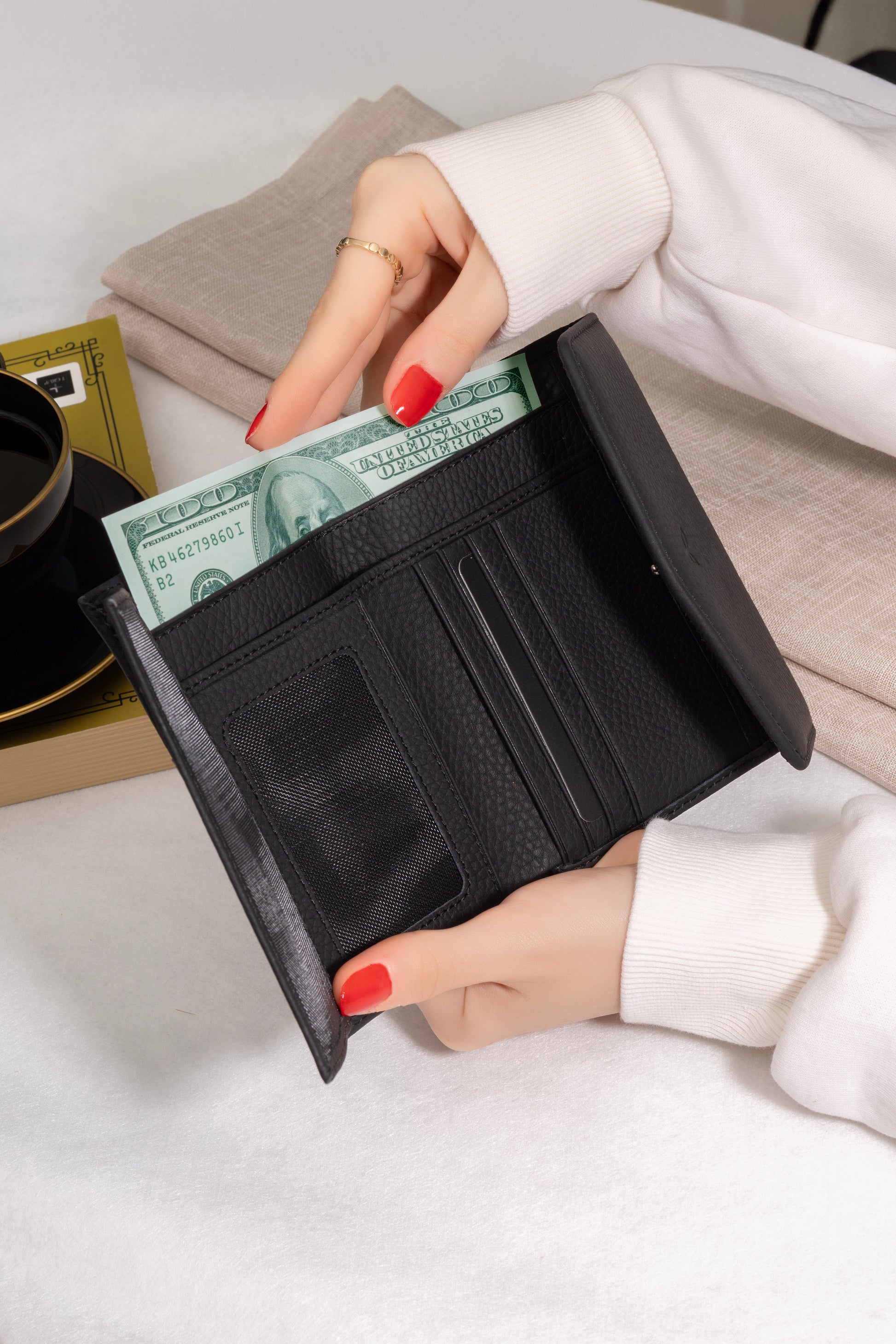 Bölme | 9 adet kart, 2 adet kağıt para, 1 adet bozuk para, 1 adet şeffaf kimlik, 2 adet şeffaf geniş cep bölmesi |
